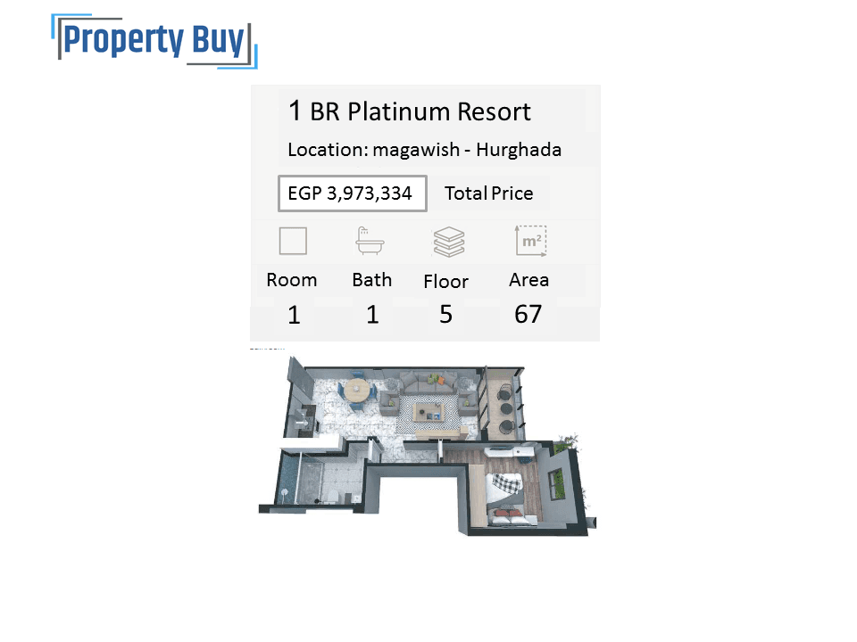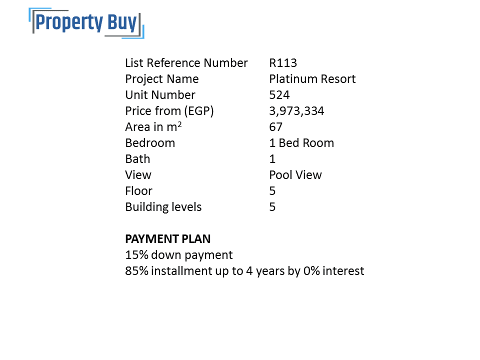 للبيع شقة 1 غرفة نوم مساحة 67 متر الدور الخامس فيو حمام سباحة و بحر