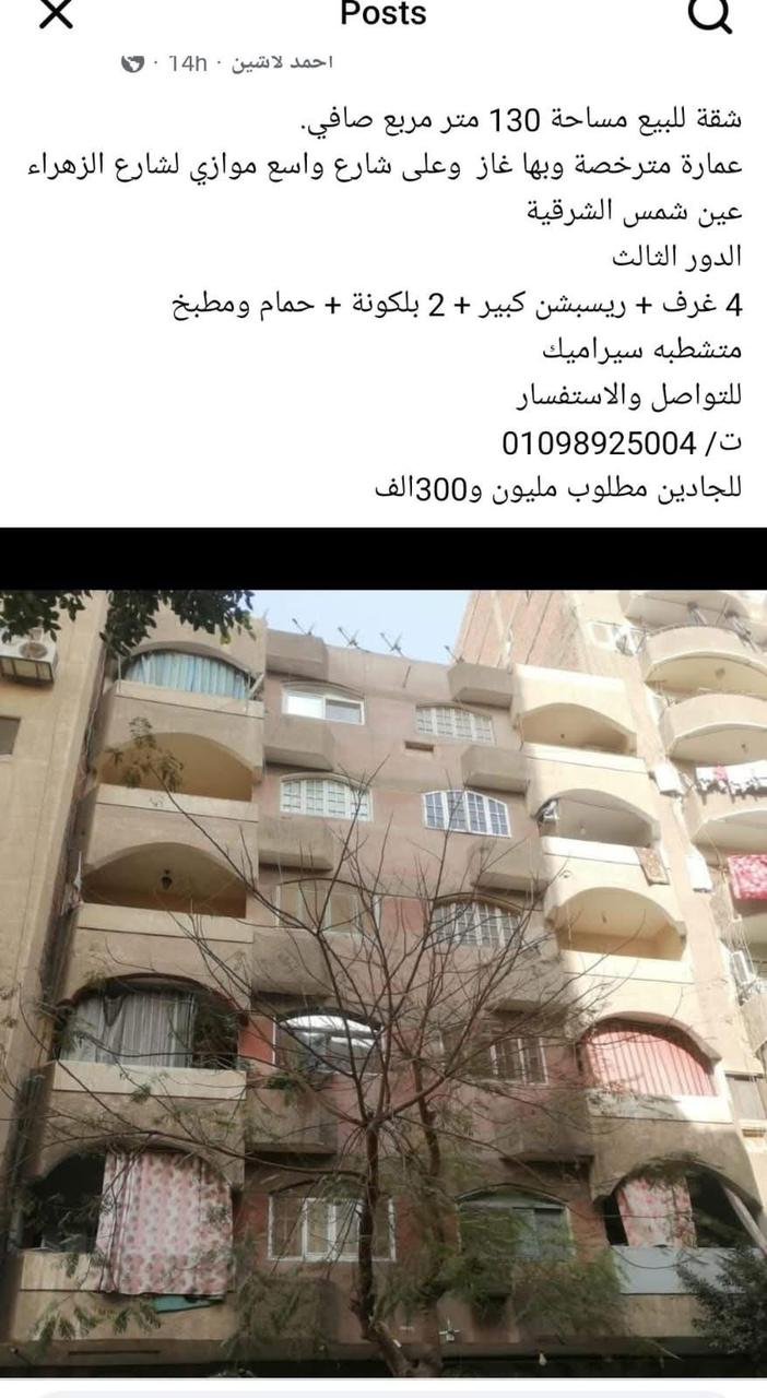 شقه ١٣٠ م مرخصه ومسجله بالشهر العقاري الشارع عرضه كبير وموازي لشارع الزهراء عين شمس الشرقية الدور الثالث