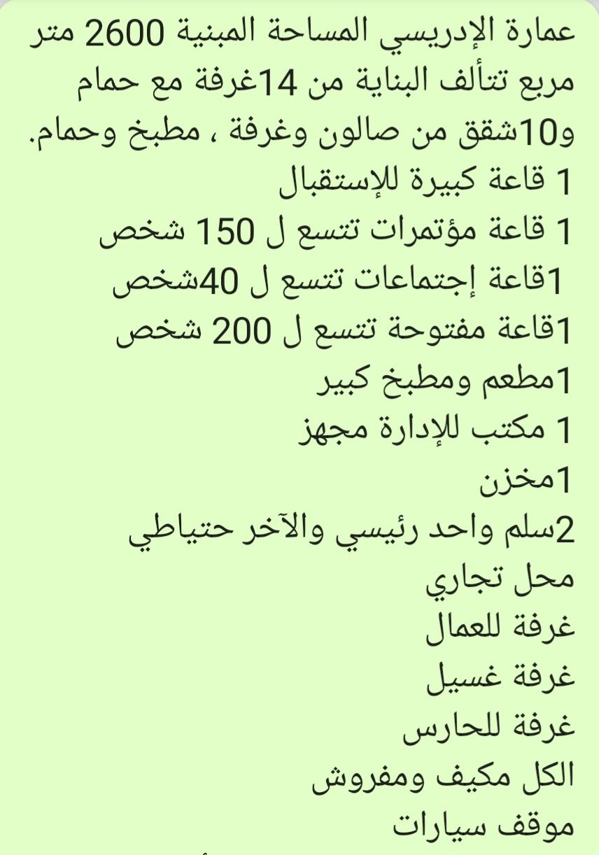 فندق الإدريسي العماره مبني في عام 2014 الأوراق وثائق معتمده لدى الدوله المساحه المدنيه 2600 م ، مربع فندق يتألف من 10 شقق ، تتألف الشقه من غرفة نوم وصالون وحمام ومطبخ الكل مفروش ومكيف + 14 غرفة نوم وحمام + 4قاعات إجتماعات